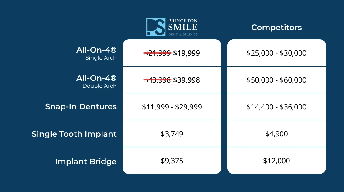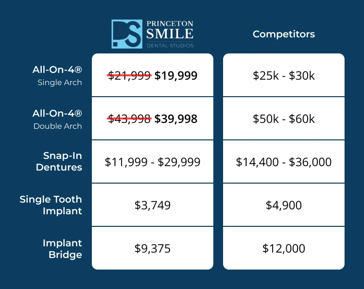 At Princeton Smile Dental Studios, you can rest assured that you’re getting the absolute best price for your dental implant treatment without sacrificing quality. This is due to our state-of-the-art technology and in-house lab, which allow us to complete your entire procedure and teeth fabrication under one roof. Not only does this lead to fewer visits, quicker turnaround times, and a more precise final result, but also lets us pass our savings onto you!